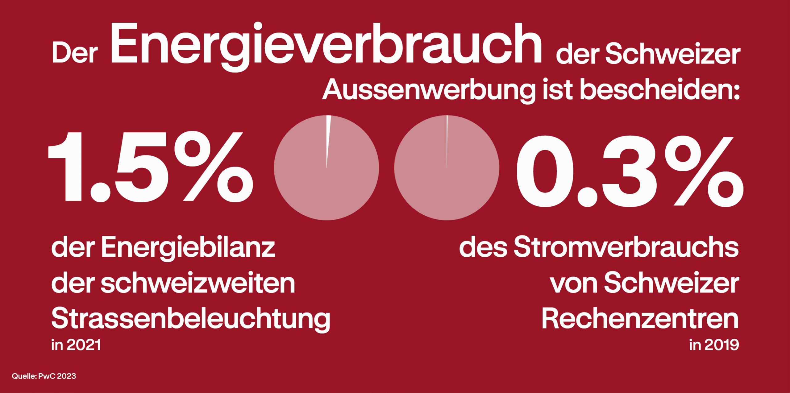 Der Energieverbrauch eines hinterleuchteten Plakates beträgt 0.029 kWh, jener eines Indoor ePanels (85 Zoll) 0.312 kWh und ein Outdoor ePanel (75 Zoll) verbraucht 0.700 kWh. Dieser Energieverbrauch ist bedeutend geringer als beispielsweise jener für Video-Streaming mit einem 65 Zoll Fernseher, mit einem Verbrauch von 1.3 kWh.
