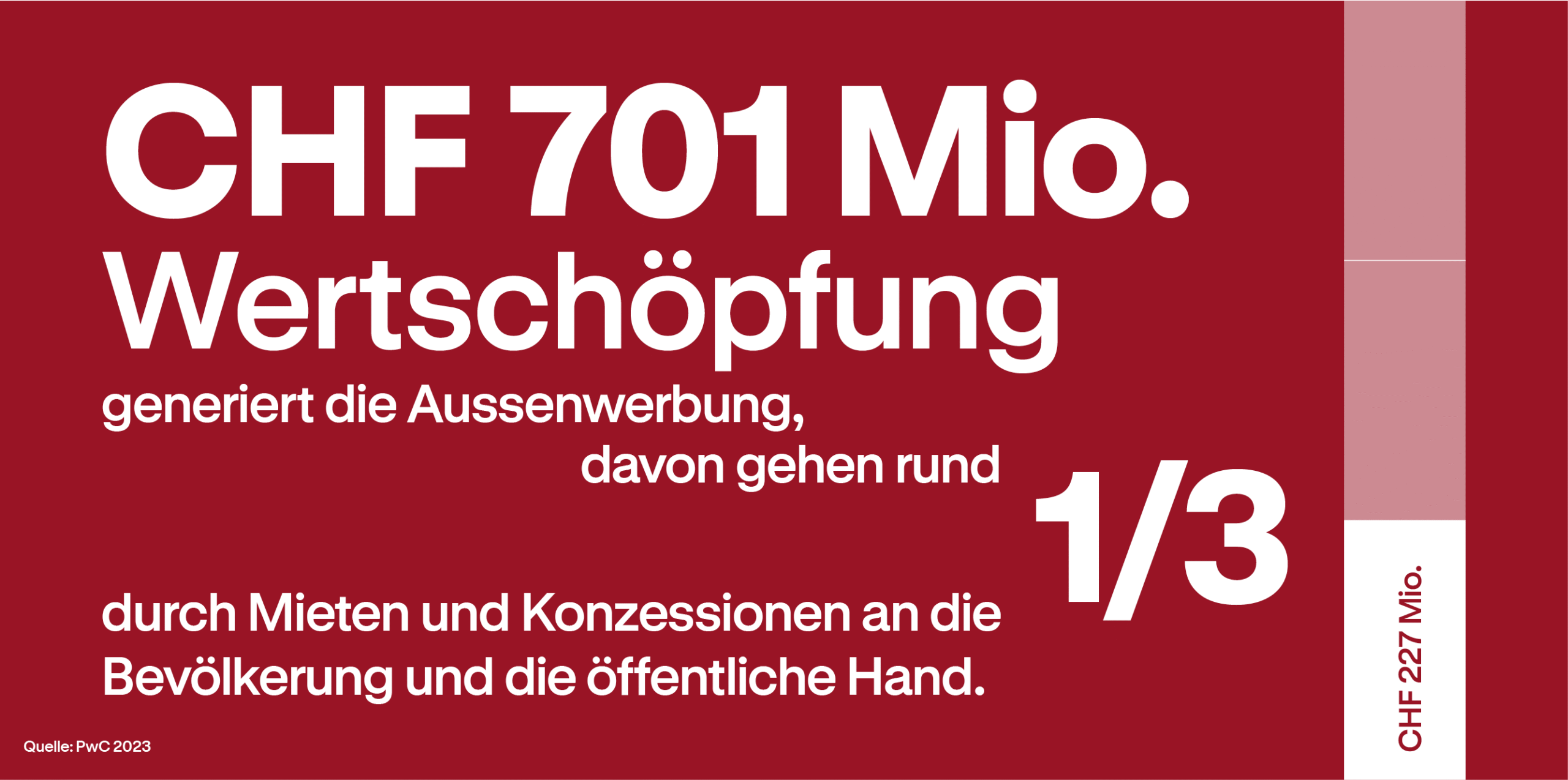 60 Prozent aus einem Franken Bruttoumsatz der Plakatbranche fliessen wieder an die Bevölkerung und die öffentliche Hand, den öffentlichen Verkehr und die Bevölkerung zurück. So werden Konzessionen direkt an öffentlich-rechtliche und privat-wirtschaftliche Eigentümerinnen und Eigentümer bezahlt. Über Steuern und Investitionen in öffentliche Infrastruktur wie Bushaltestellen profitieren wir alle indirekt von einer starken Plakatbranche.